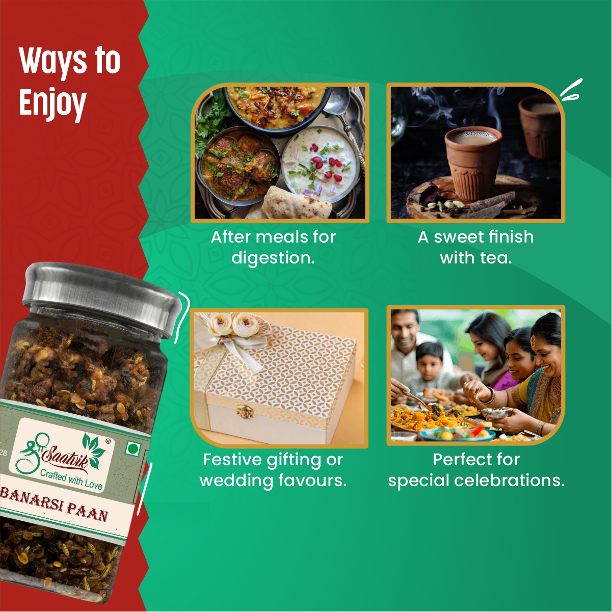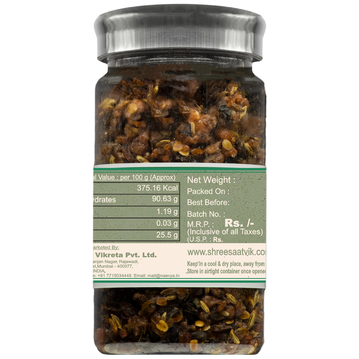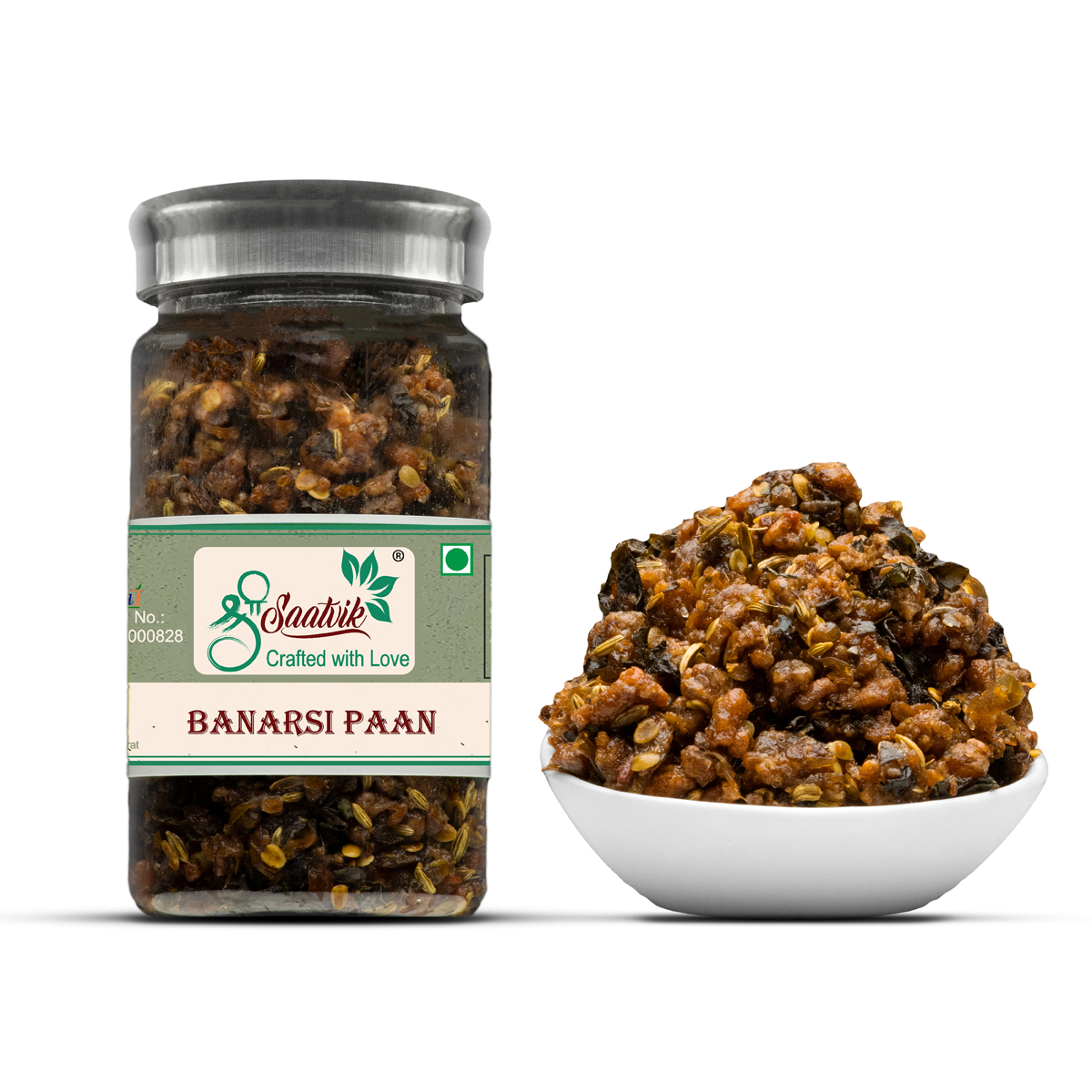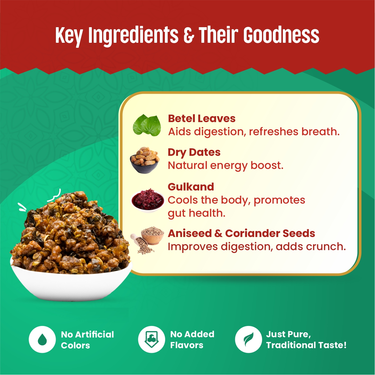 Is a soothing combination of Dry Dates, Paan Leaf, Sweetened Rose Petal Paste, Sugar, Fennel seeds, Gooseberry, Herbs, Cardamon, Corriander Seed and a post meal snack.
