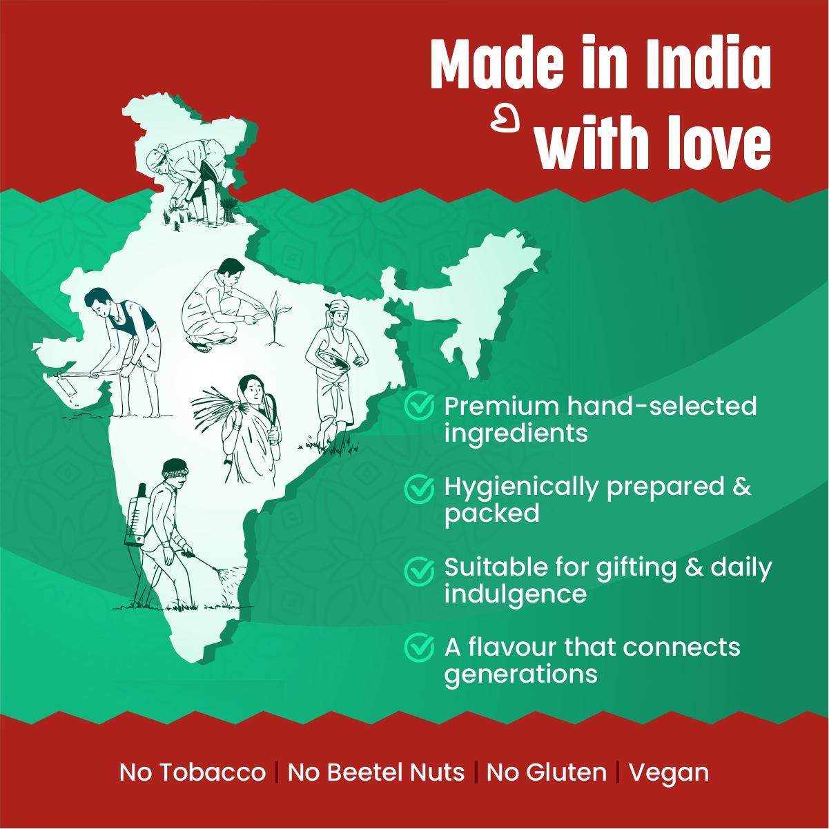 • A soothing combination of Dry Dates, Paan Leaf, Sweetened Rose Petal Paste, Sugar, Fennel seeds, Gooseberry, Herbs, Cardamon, Corriander Seed, Menthol, Artificial Flavor, Edible Color