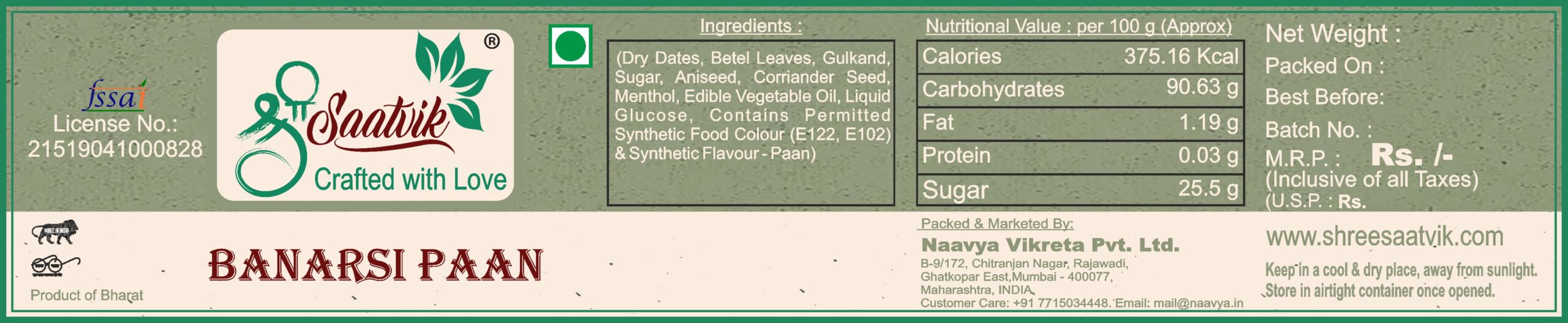 Ingredient : Dry Dates, Betel Leaves, Gulkand, Sugar, Aniseed, Corriander Seed, Menthol, Edible Vegetable Oil, Liquid Glucose, Contains Permitted Synthetic Food Colour (E122, E102) & Synthetic Flavour – Paan
