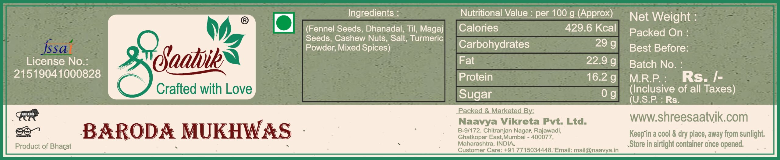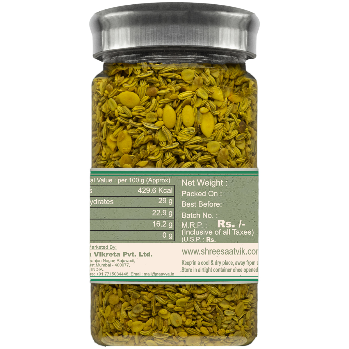 Ingredient : (Fennel Seeds, Dhanadal, Til, Magaj Seeds, Cashew Nuts, Salt, Turmeric Powder, Mixed                            Spices)