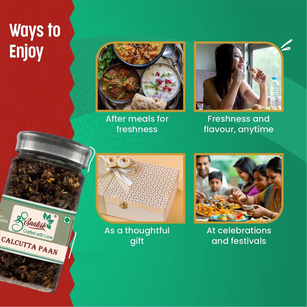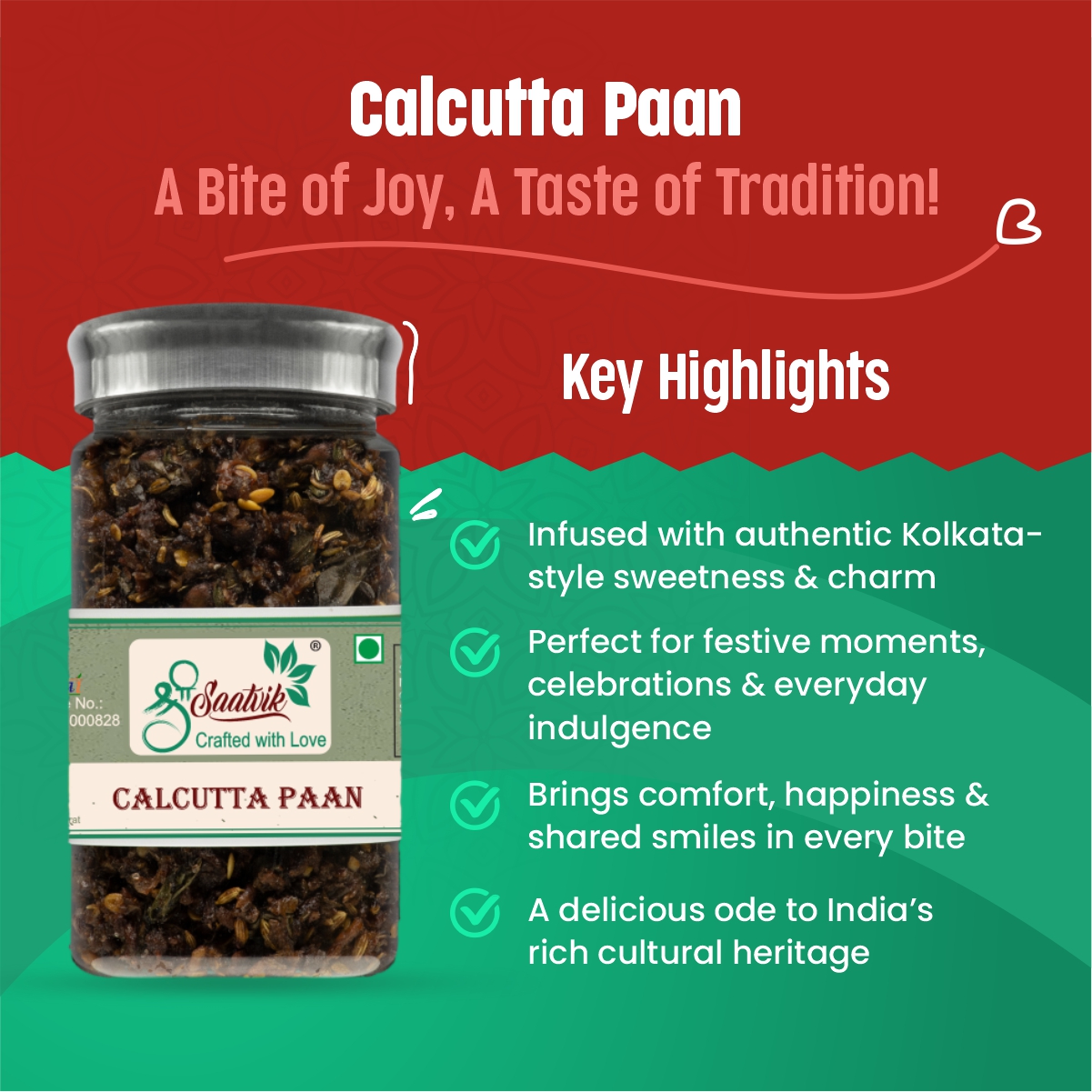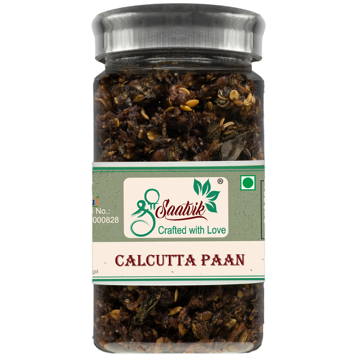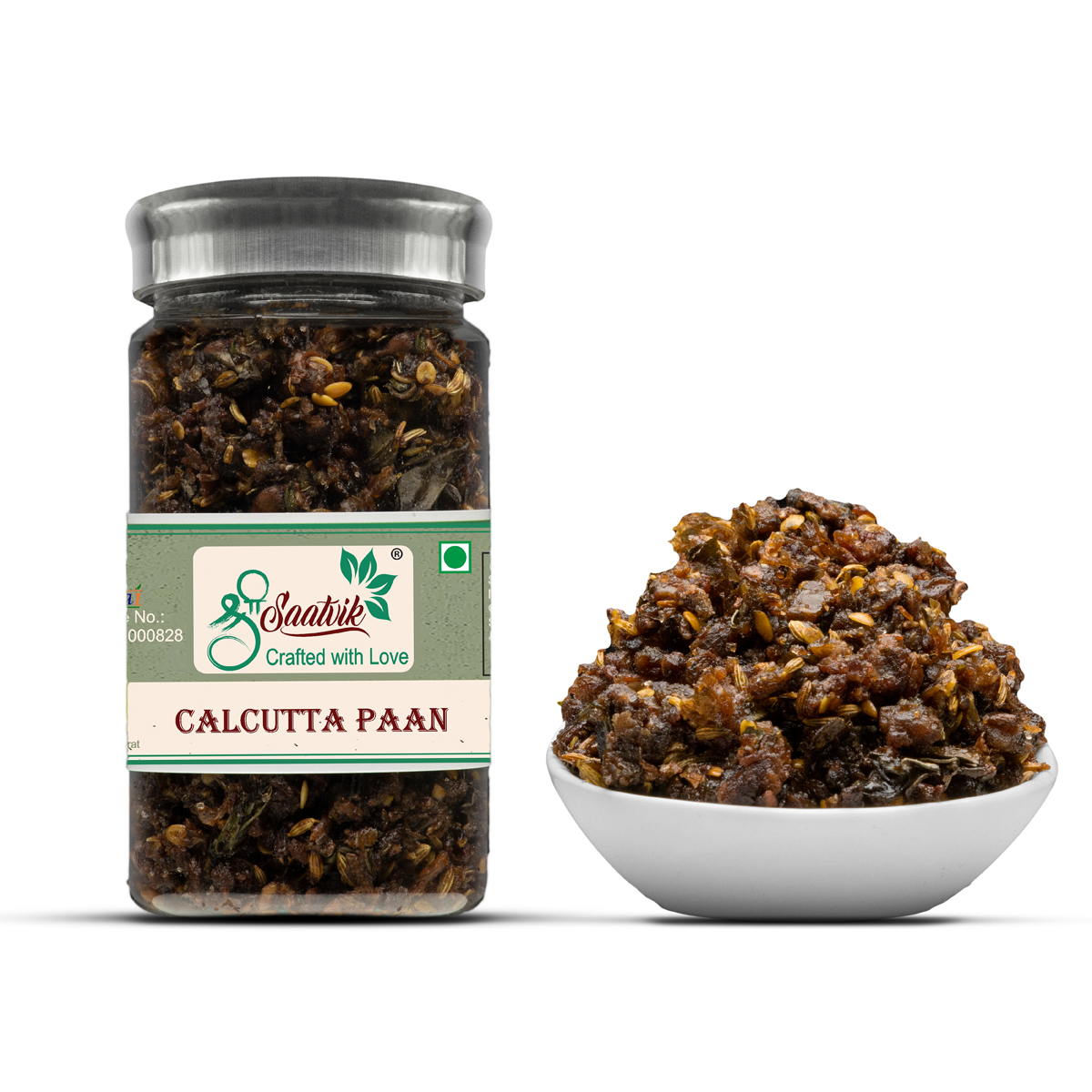 Calcutta Paan is a Delightful composition of Betel Leaves, Sweetened Rose Petals Paste, Fennel Seeds, Coriander Seeds, Dry Dates, Cardamom.