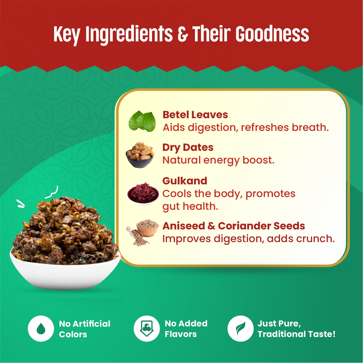 • Delightful composition of Betel Leaves, Sweetened Rose Petals Paste, Fennel Seeds, Coriander Seeds, Dry Dates, Cardamom.