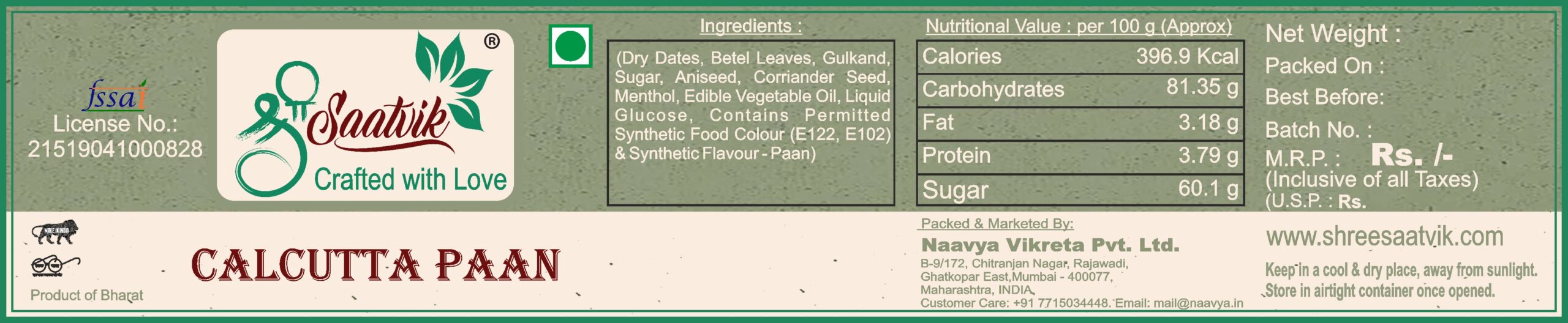 Ingredient : Dry Dates, Betel Leaves, Gulkand, Sugar, Aniseed, Corriander Seed, Menthol, Edible Vegetable Oil, Liquid Glucose, Contains Permitted Synthetic Food Colour (E122, E102)