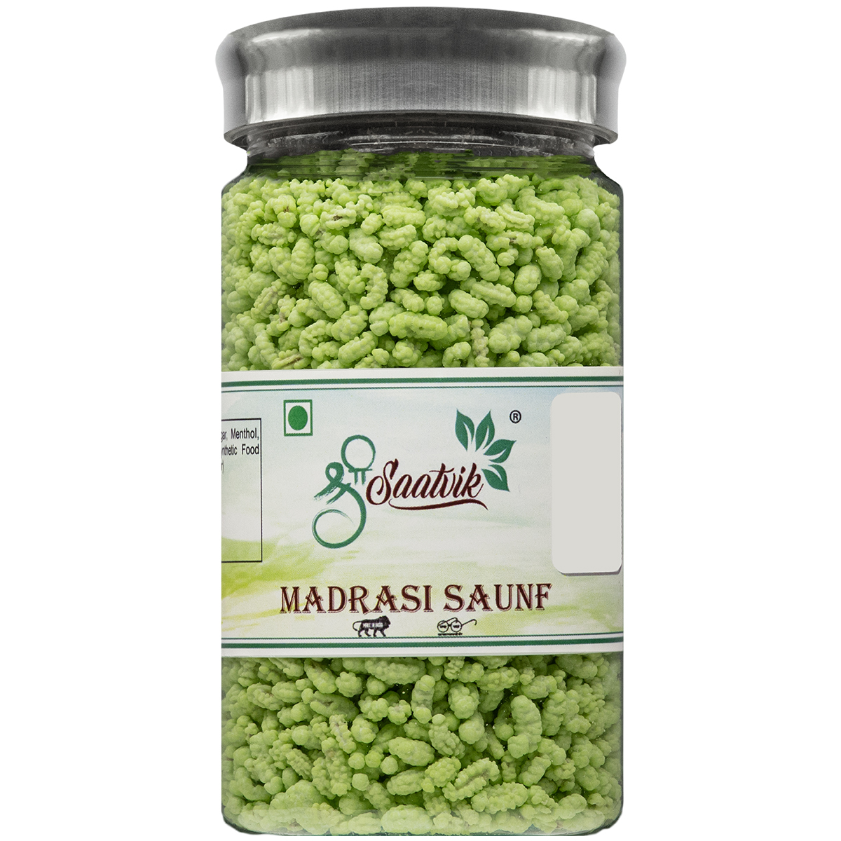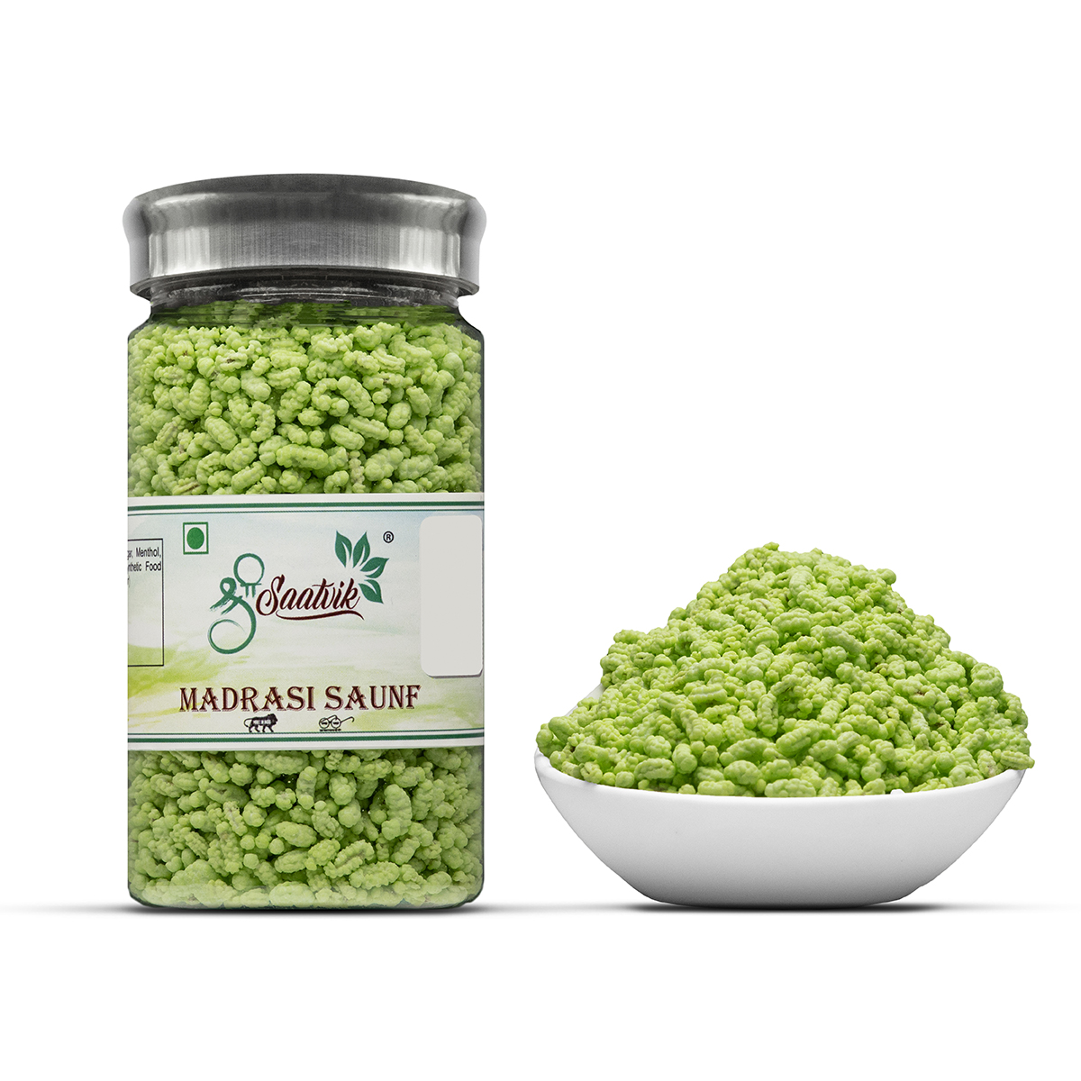 Madrasi Saunf is a Refreshing pack fennel seeds and menthol. Fennel seeds are used in Ayurvedic medicines. Helps combat bad breath.