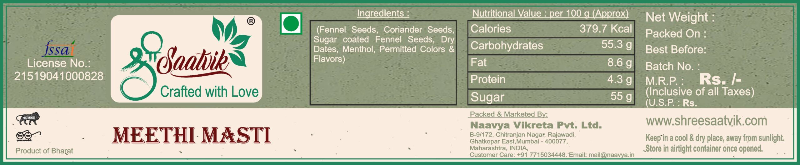 Meethi Masti is a Combination of Fennel seeds, coriander seeds, dry dates and menthol. Fennel seeds facilitates fresh breath and aids digestion.