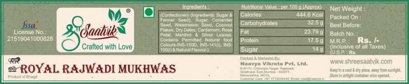 Ingredient : (Confectionery (Ingredients: Sugar & Fennel Seed), Sugar, Coriander Seed, Watermelon Seed, Coconut Flakes, Dry Dates, Cardamom, Rose Petal, Menthol & Silver Leaves. Contains Permitted Natural food Colours-INS-150D, INS-141(i), INS-100(i) & Natural Flavors.)