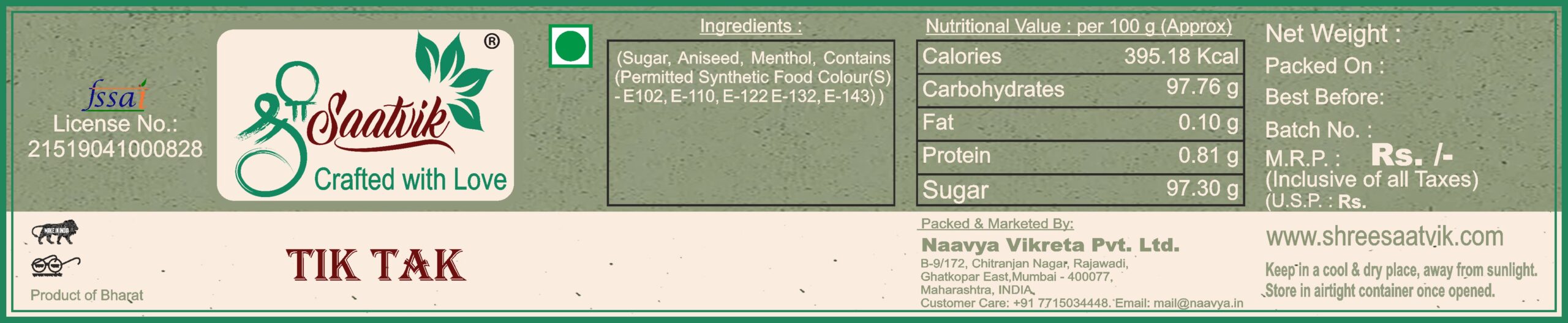Ingredient : (Sugar, Aniseed, Menthol, Contains (Permitted Synthetic Food Color(S) – E102, E-110, E-122 E-132, E-143) )