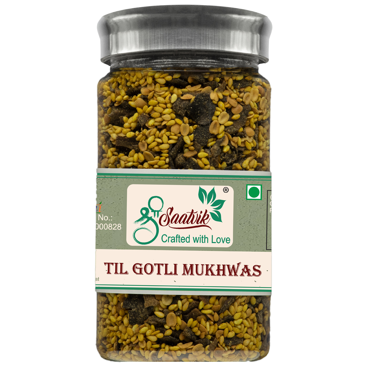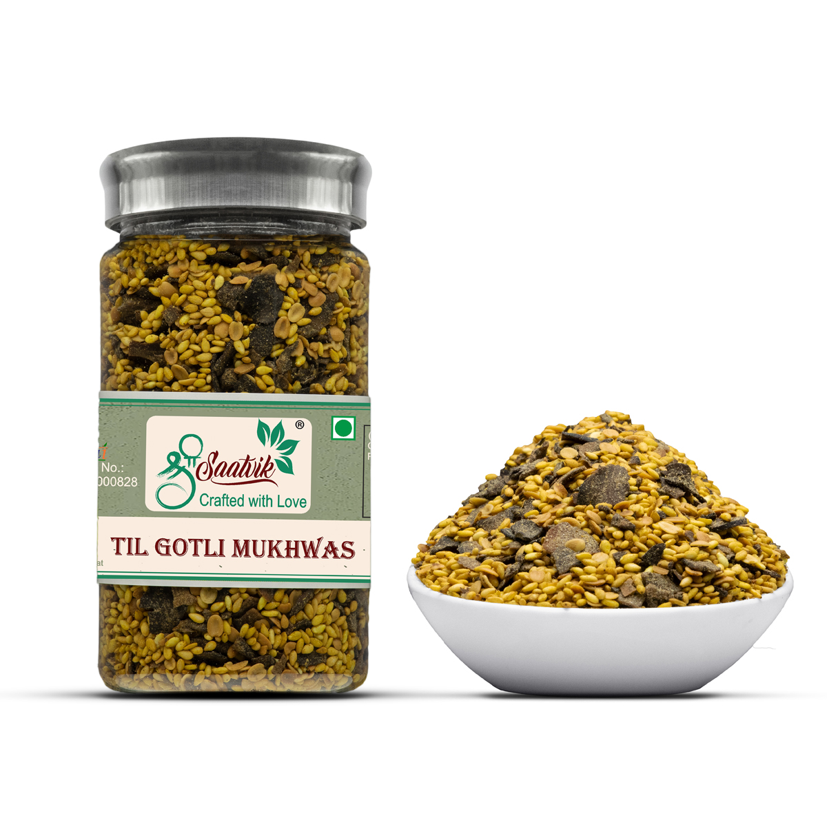 Til Gotli Mukhwas is a Rich flavors of Sesame Seeds, Dry Mango Seeds, Coriander Seeds, Rock Salt, Black Pepper, Mixed Spices. Dry mango helps in good blood circulation. Coriander seeds help combat bad breath.